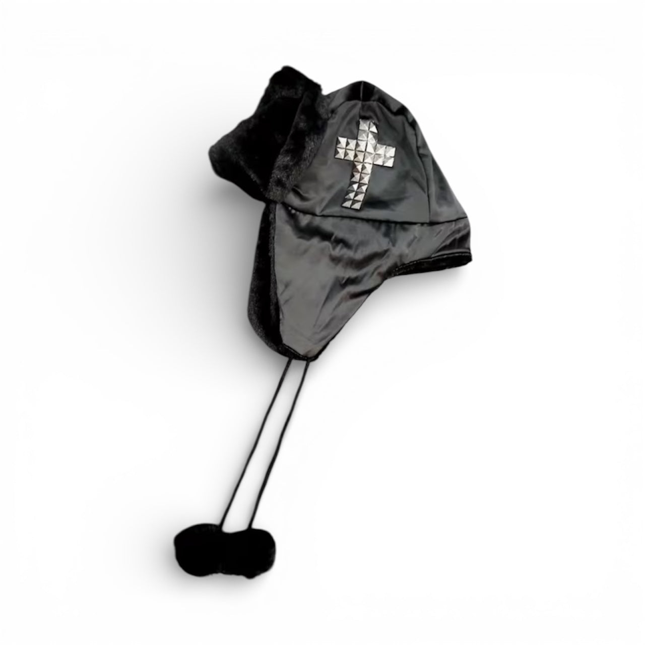 - Chapka Y2K noie avec croix à strass argenté + pompon.